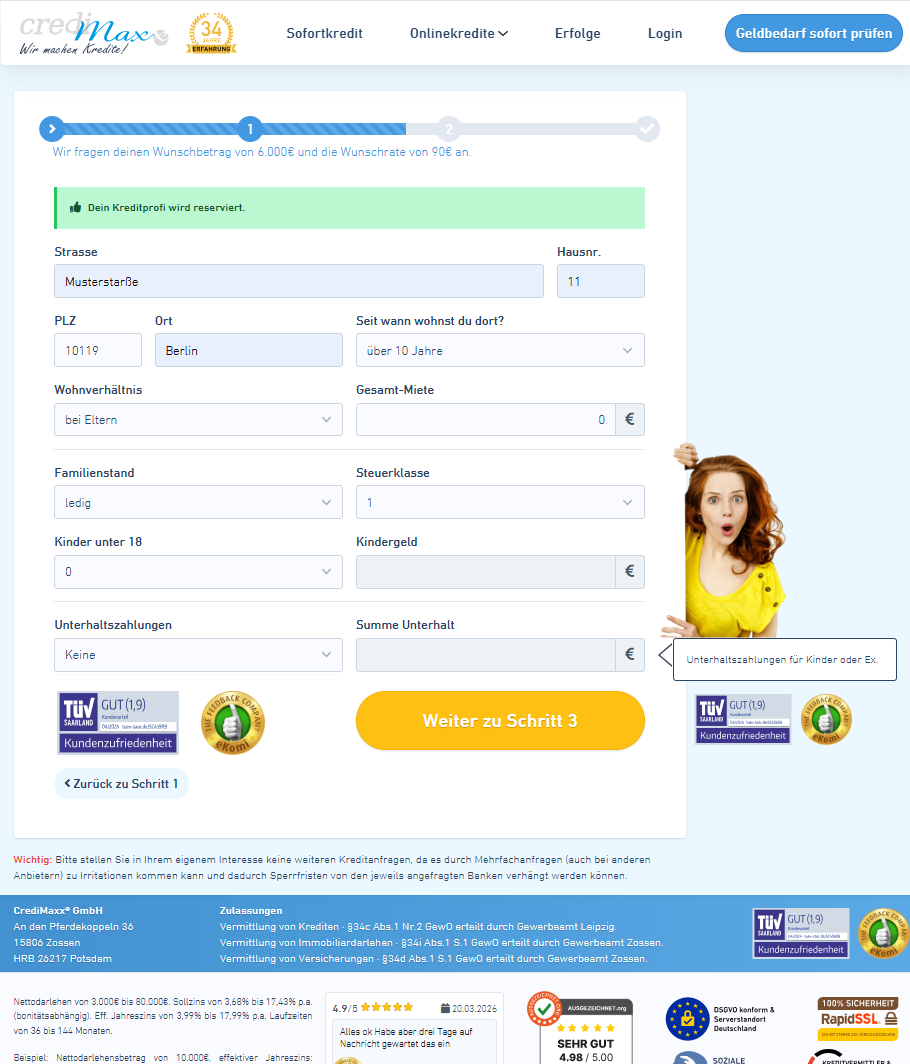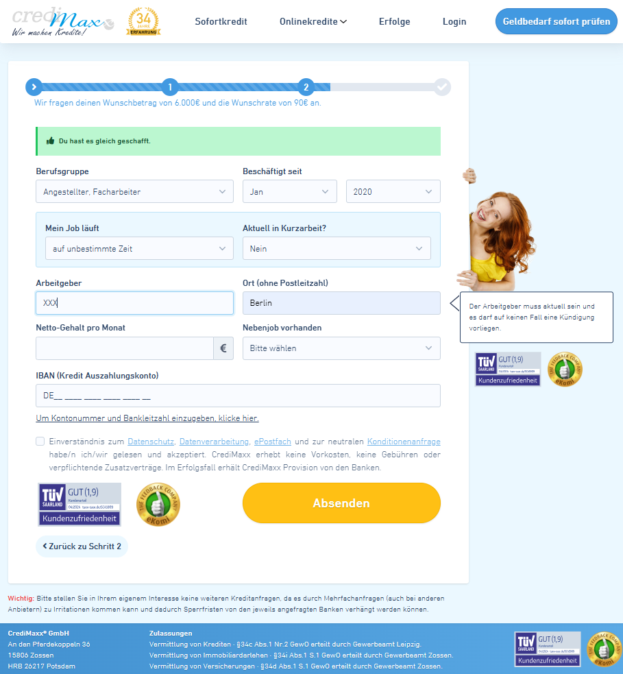 Schnell geht es zur zweiten Seite der Beantragung, auf der sich im unteren Teil ein wichtiger Hinweis finden lässt: „CrediMaxx erhebt keine Vorkosten, keine Gebühren oder verpflichtende Zusatzverträge. Im Erfolgsfall erhält CrediMaxx Provision von den Banken.“ Dieser Hinweis ist sehr wichtig, um auch den letzten Skeptikern aufzuzeigen, dass es durchaus auch Vermittler gibt, die sauber und fair arbeiten.
