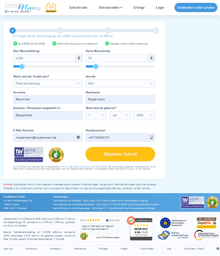 Der Ablauf der Antragstellung ist klar strukturiert und sehr kurz gehalten. CrediMaxx beschränkt sich bei der Abfrage der Daten auf die wichtigsten Fakten aus dem persönlichen und wirtschaftlichen Umfeld des Interessenten. Am Ende ist sowohl ein komplett papierfreier Online Antrag sowie ein Antrag in Papierform möglich.