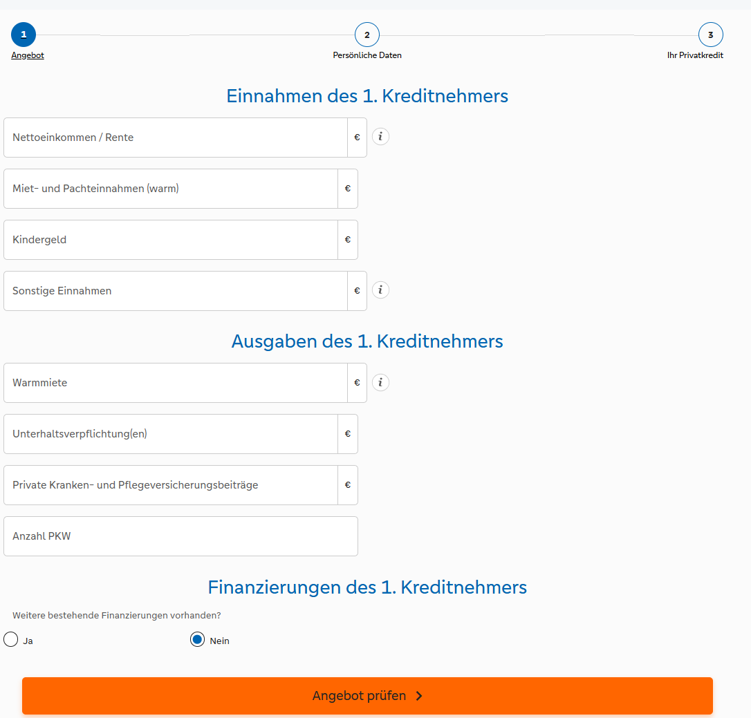 Auf der folgenden Seite werden die ersten wirtschaftlichen Daten vom Kreditnehmer abgefragt. Wer keine genauen Angaben zur Verwendung vom Kredit machen will, sollte sich für „Sonstiges“ entscheiden. Die Angaben zu den monatlichen Einnahmen und Ausgaben sollten korrekt sein, da diese im Nachgang mit Hilfe von aussagekräftigen Unterlagen belegt werden müssen.