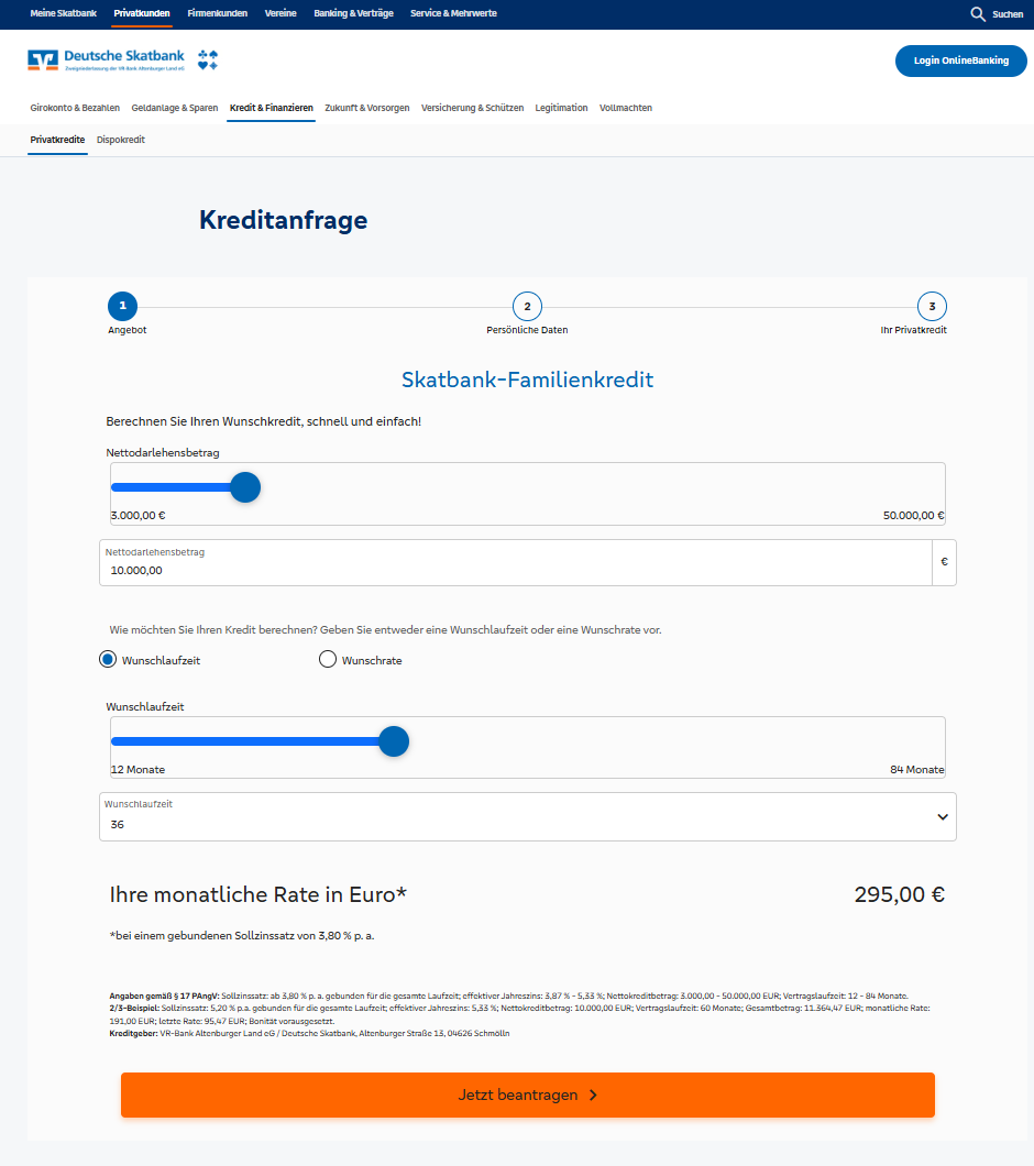 Mit Hilfe des Rechentools auf der Internetseite der Deutschen Skatbank kann der Interessent im Vorfeld prüfen, welche monatlichen Raten bei einer Kombination aus gewünschter Kreditsumme und Laufzeit entstehen würden. Allerdings ist das Rechentool nicht gleich auf der Startseite hinterlegt, sondern befindet sich auf einer Unterseite zum Kreditantrag. Hier wäre es wünschenswert, wenn das Rechentool sichtbarer präsentiert wird.