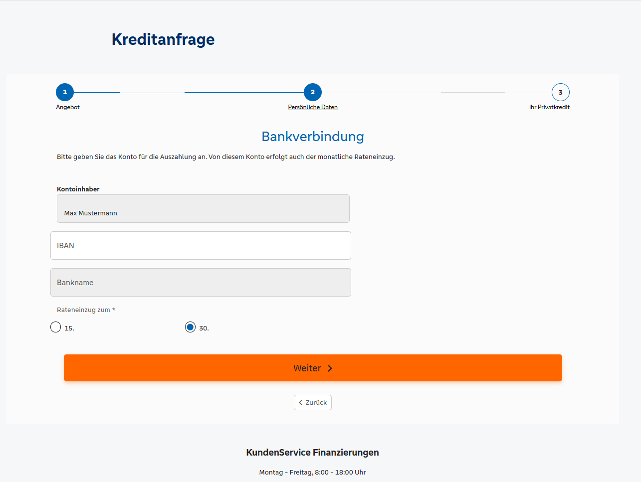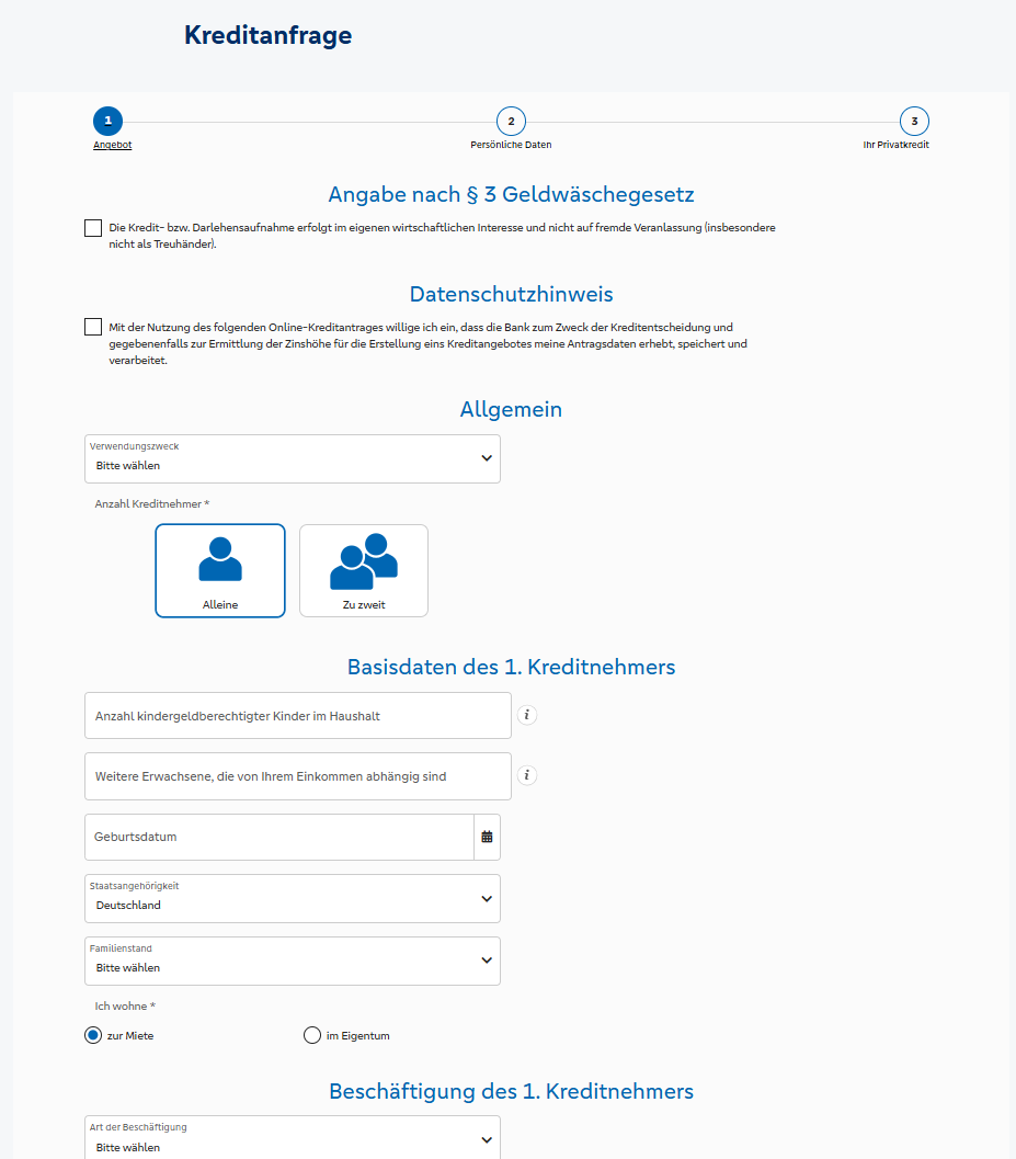 Bei einer weiteren Abfrage der persönlichen Daten müssen Angaben zum Beschäftigungsverhältnis getätigt werden. Zu guter Letzt werden persönliche Angaben zur Kontoverbindung erfragt. Der Kreditinteressent muss zudem einer Abfrage der SCHUFA und einer Speicherung der Daten bei der SCHUFA zustimmen.