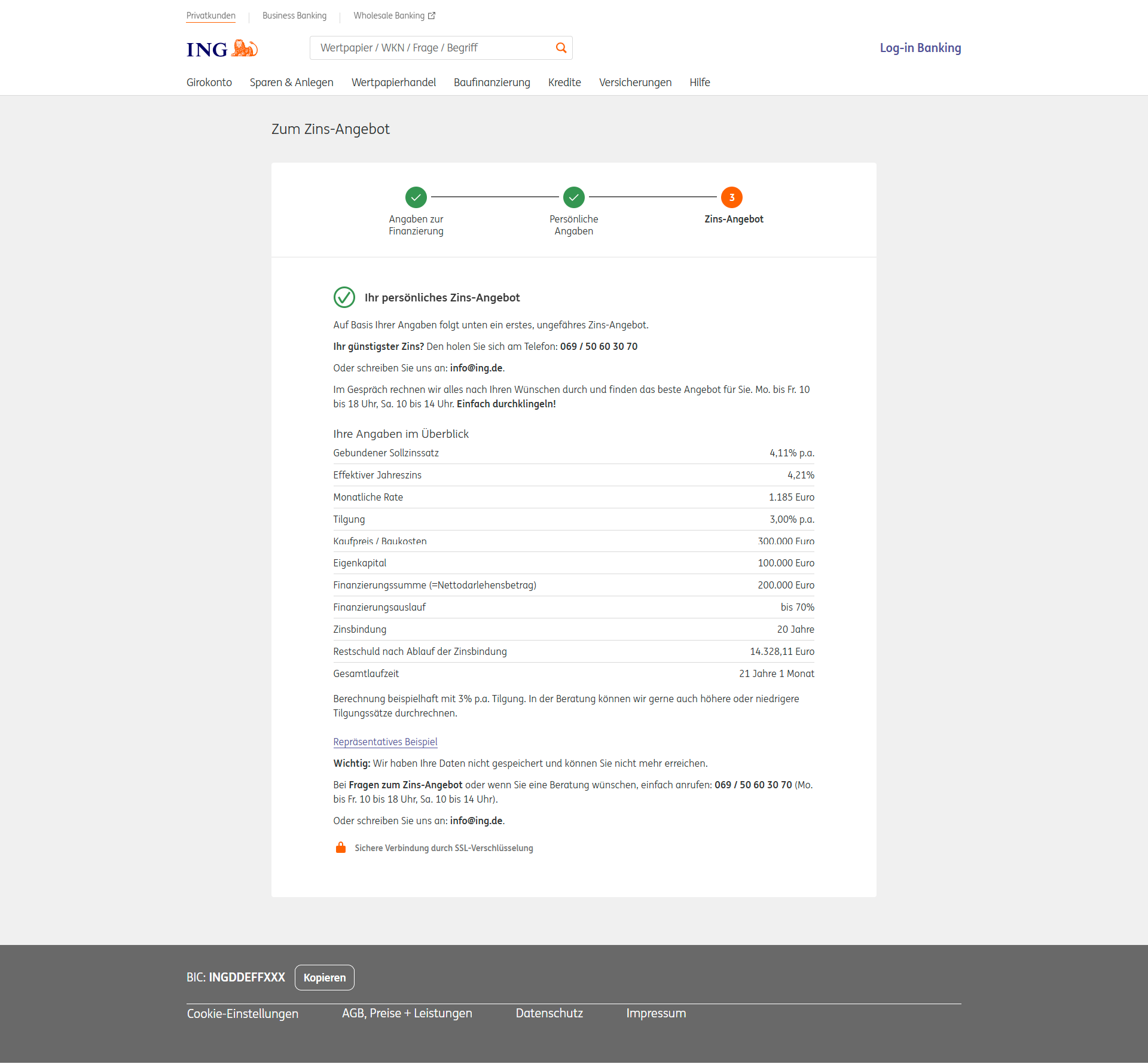 Die unverbindliche Anfrage setzt sich aus den Eckdaten der Finanzierung zusammen, unter anderem aus der Finanzierungsart, dem Objekt, der Nutzung, dem Kaufpreis und dem Eigenkapital. Schritt zwei umfasst die persönlichen Daten inklusive Einkommen und die Kontaktdaten (optional). Wer möchte, kann der Kontaktaufnahme durch die ING oder das Schwesterunternehmen Interhype zustimmen. Ein solches Gespräch dauert 30 bis 60 Minuten und dient dazu, die Finanzierung perfekt auf den Kunden abzustimmen. Das Ergebnis sind mehrere Finanzierungsvorschläge, aus denen man wählen kann. Auch wenn man sich gegen die Kontaktaufnahme entscheidet, erhält man ein ungefähres Zinsangebot.