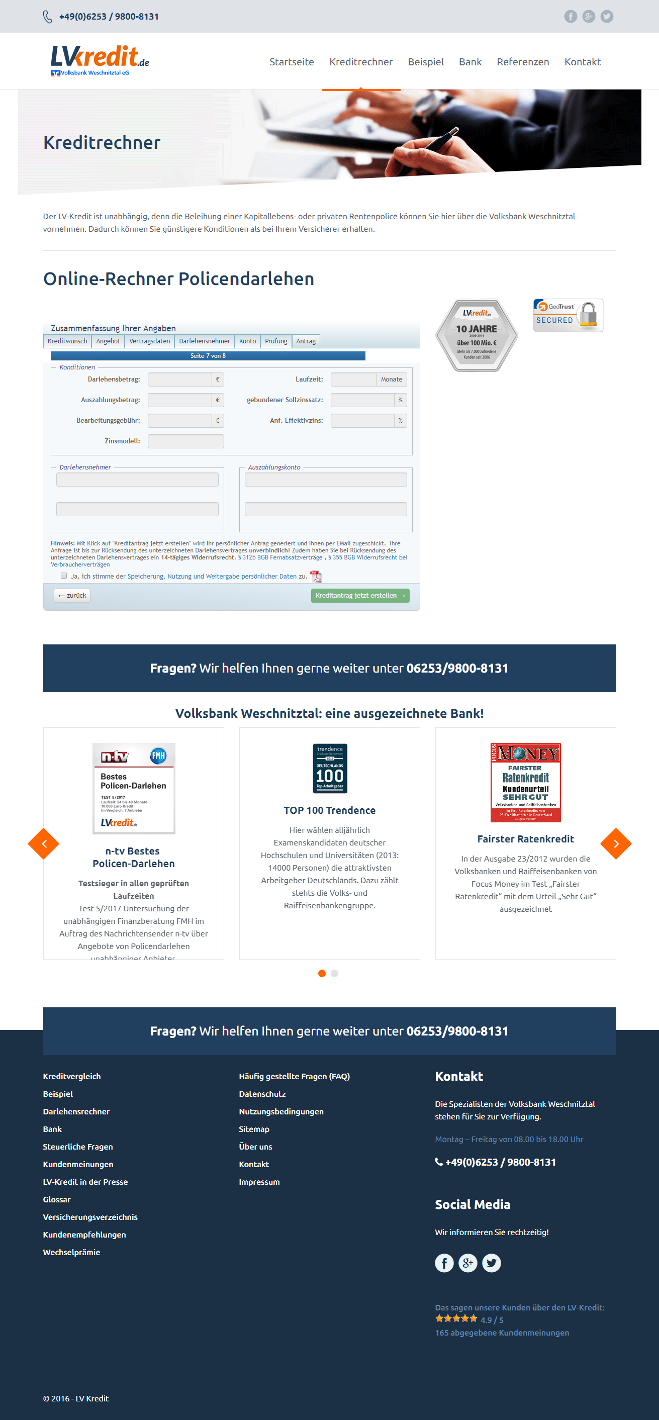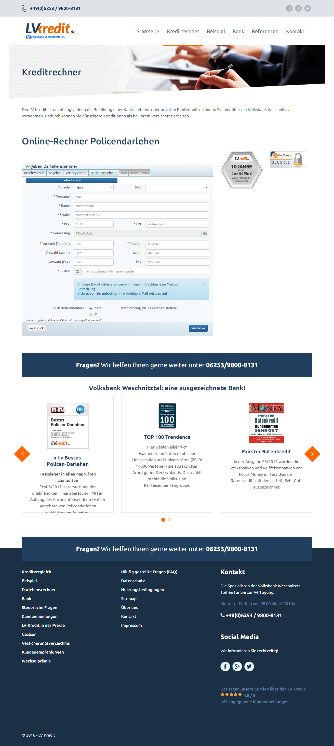 Der Service präsentiert sich etwas durchwachsen, da das Online-Kundenkonto nicht sofort ersichtlich ist und keine App angeboten wird. Dafür gibt es eine gut aufgestellte Kundenhotline, deren Mitarbeiter freundlich und gleichzeitig kompetent sind. Auch andere Kommunikationswege können gewählt werden. In Summe bietet LV-Kredit.de den besten Service aller auf Kreditvergleich.net getesteten Anbieter für Policendarlehen.