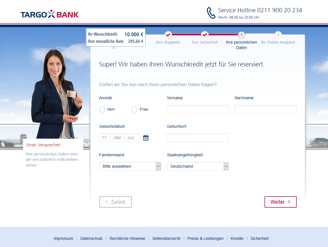 Auch wenn sich die Antragstrecke durch ihre vielen Seiten etwas in die Länge zieht, werden alle kreditrelevanten Fragen ordentlich und sachlich abgefragt. Kleine Hilfestellungen erleichtern das Ausfüllen der Antragstrecke.