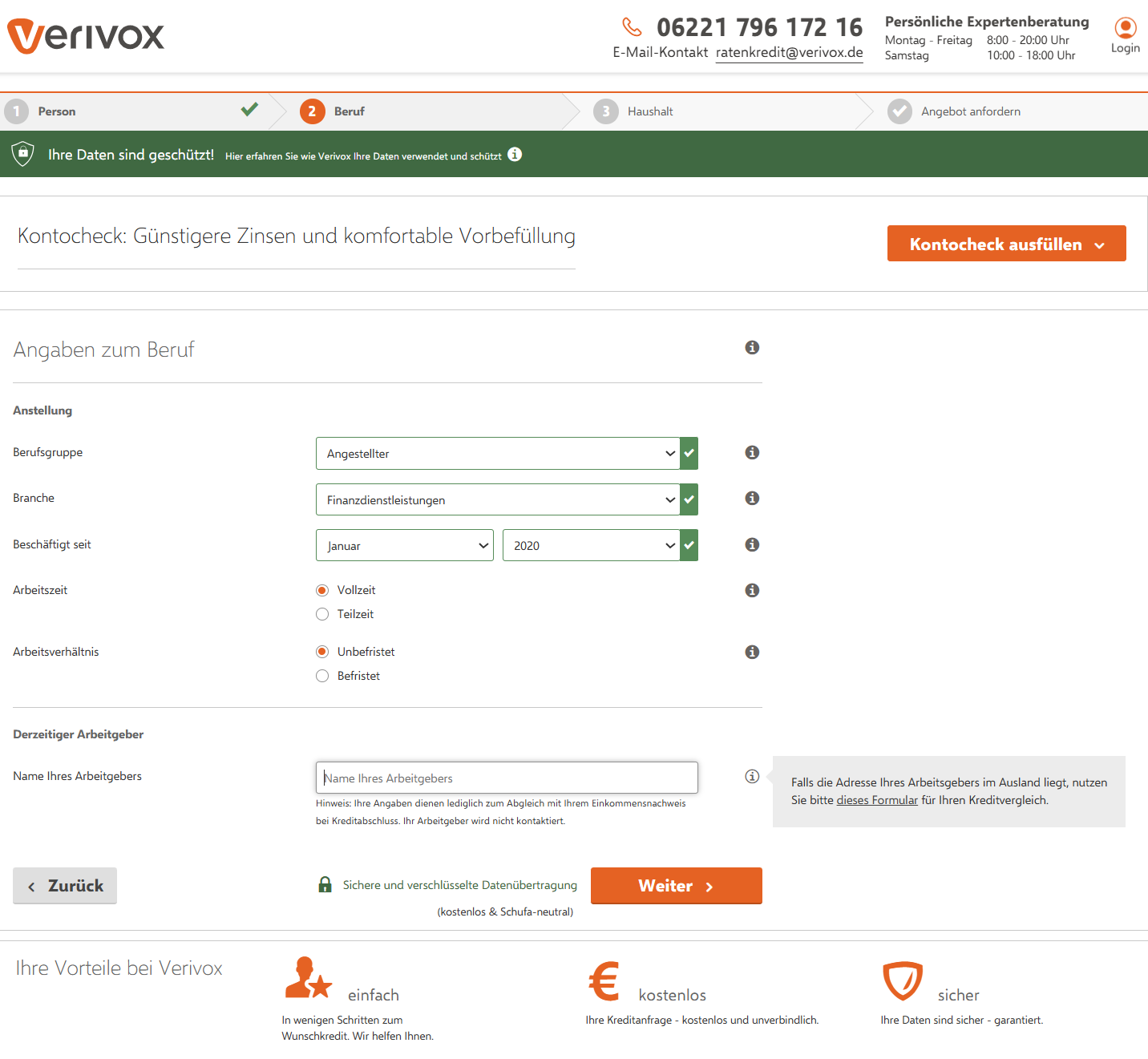 Im weiteren Verlauf wird unter anderem der Arbeitgeber abgefragt. Ergänzend dazu sind Angaben zu den persönlichen und finanziellen Verhältnissen erforderlich, die eine grundlegende Voraussetzung für die Kreditprüfung darstellen.