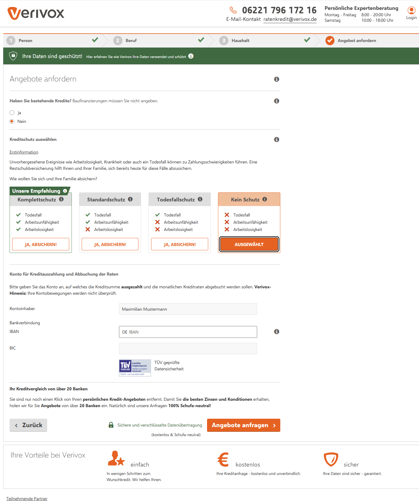 Auf der letzten Seite des Antrags entscheidet der Kreditinteressent, ob er eine Restschuldversicherung abschließen möchte, und gibt an, ob bereits weitere Kredit- oder Leasingverträge bestehen. Mit der Eingabe der Bankverbindung ist der Antragsprozess abgeschlossen.