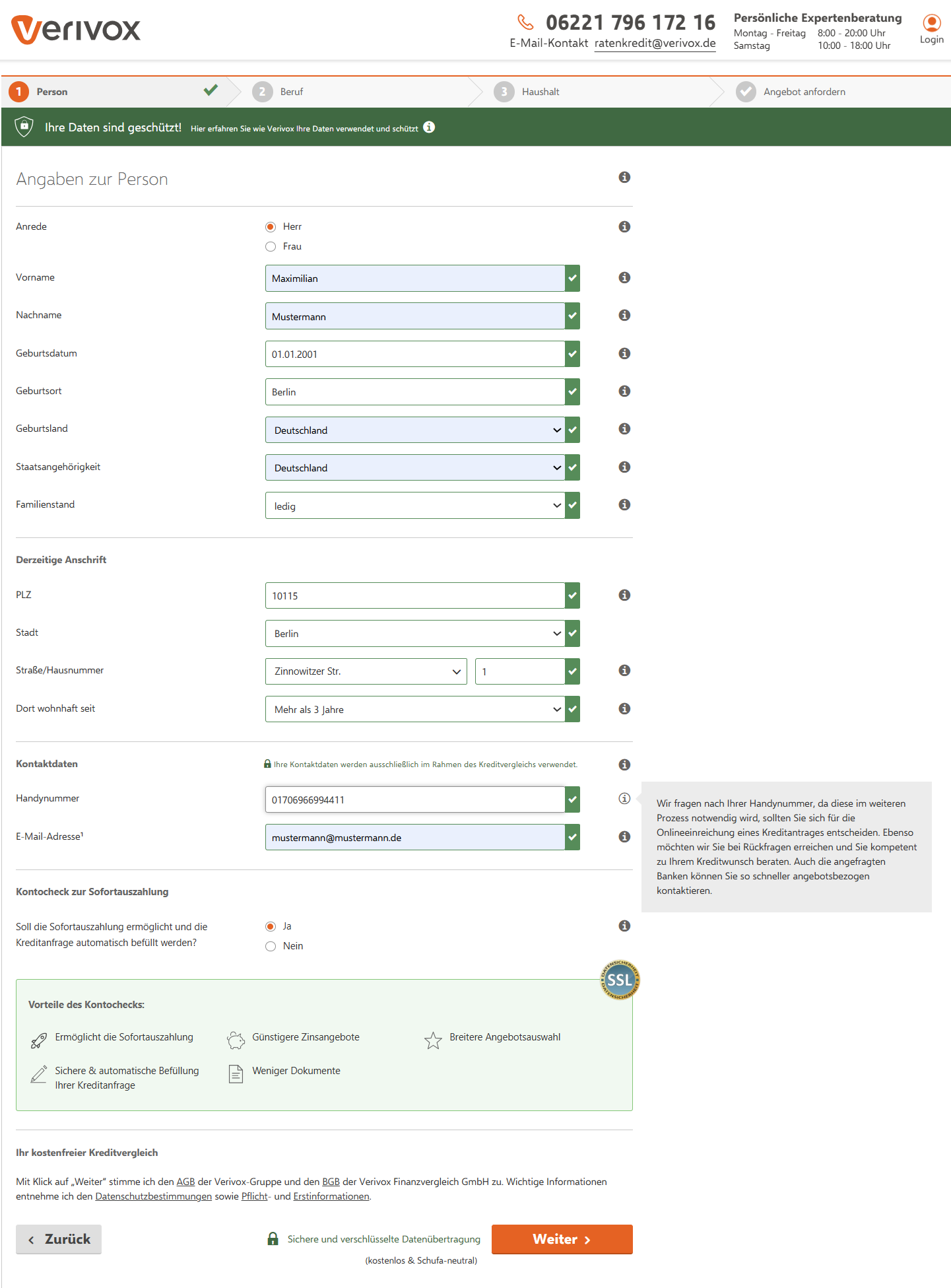 Im nächsten Schritt beginnt die eigentliche Antragstellung durch die Eingabe der persönlichen Daten. Dabei besteht die Möglichkeit, das Formular manuell auszufüllen oder die Angaben bequem über das eigene Online-Banking ergänzen zu lassen. Bestandteil dieses Prozesses ist auch der digitale Kontocheck, der Voraussetzung für eine besonders schnelle Auszahlung ist. Hierzu erteilt der Kunde Verivox einmalig die Erlaubnis, über die Online-Banking-Zugangsdaten auf das Konto zuzugreifen. Dieses Verfahren ersetzt zunehmend das manuelle Einreichen von Kontoauszügen.