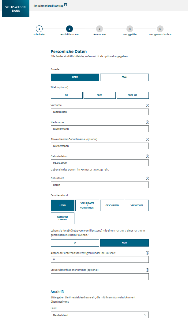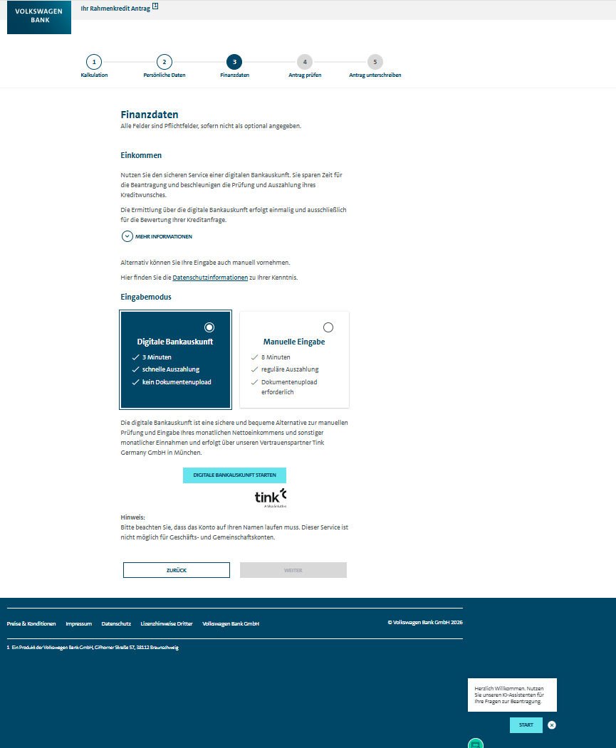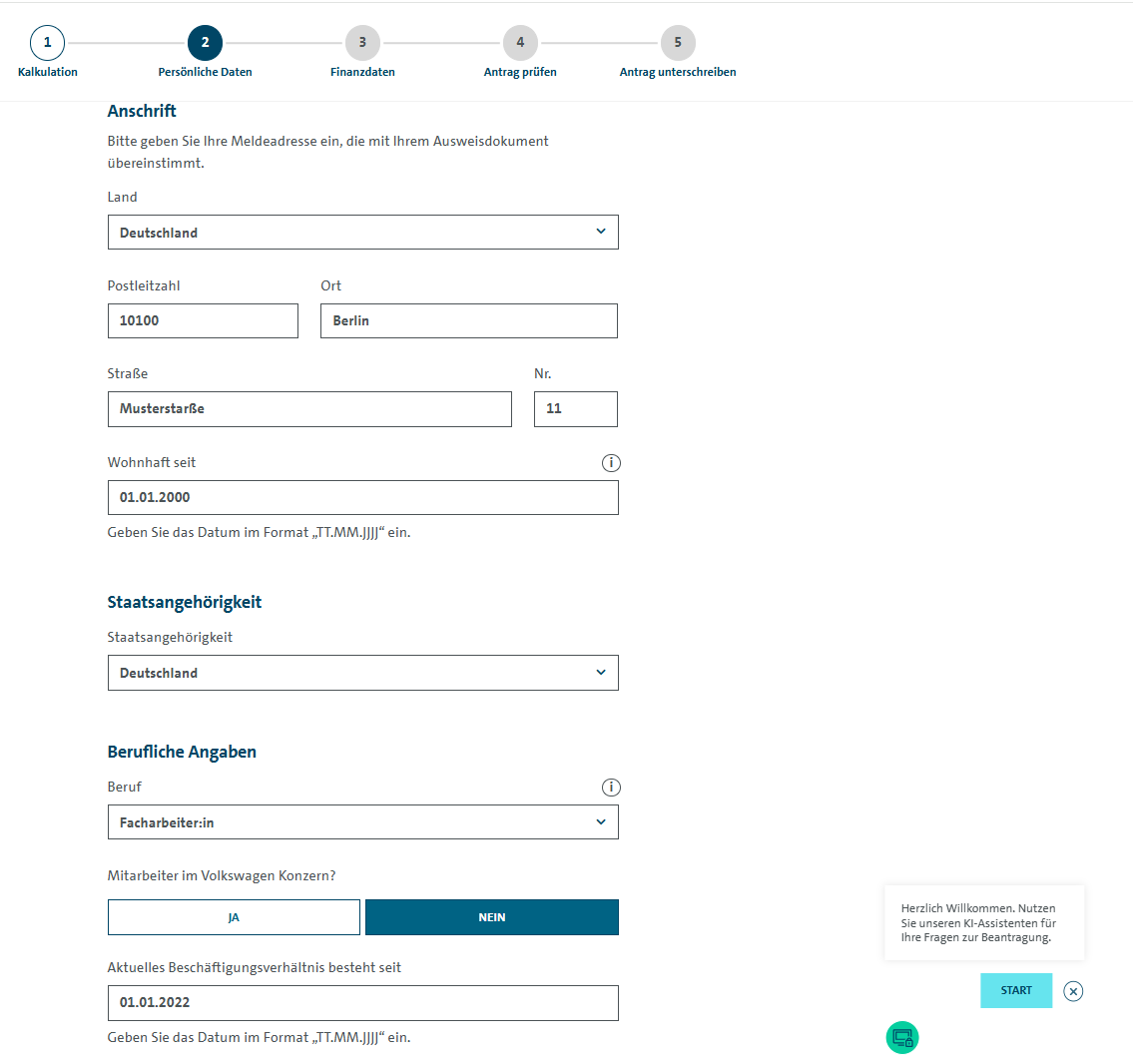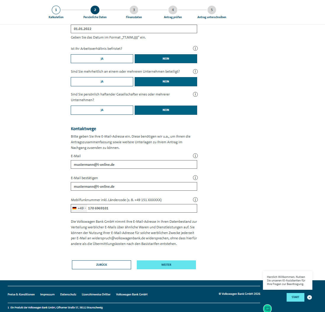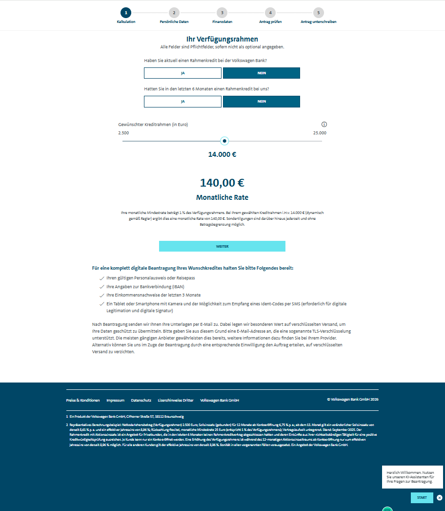 Der Antragsprozess für einen Volkswagen Bank Rahmenkredit gestaltet sich verhältnismäßig einfach. Das Programm überprüft automatisch alle Angaben auf Richtigkeit. Positiv fällt auf, dass ein Chat für mögliche Rückfragen permanent sichtbar ist. Die Antragsstrecke ist selbsterklärend.